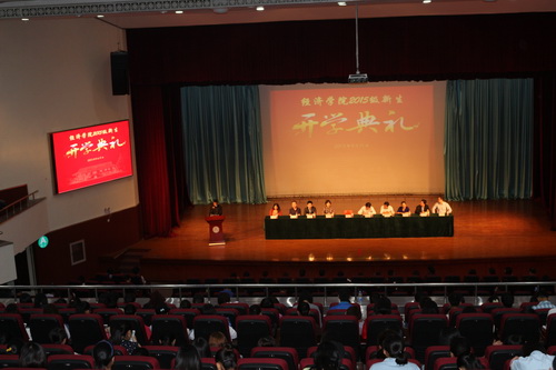 典礼在庄严的国歌声中拉开了帷幕。经济学专业闫蕾同学代表 2015 级全体新生发言,院学生会主席、金融学专业邵楠同学代表老生发言,国际经济与贸易系优秀校友、招商银行天津分行金融事业部副部经理吕松阳先生作为校友代表发言,财政系主任梁学平老师作为教师代表发言。