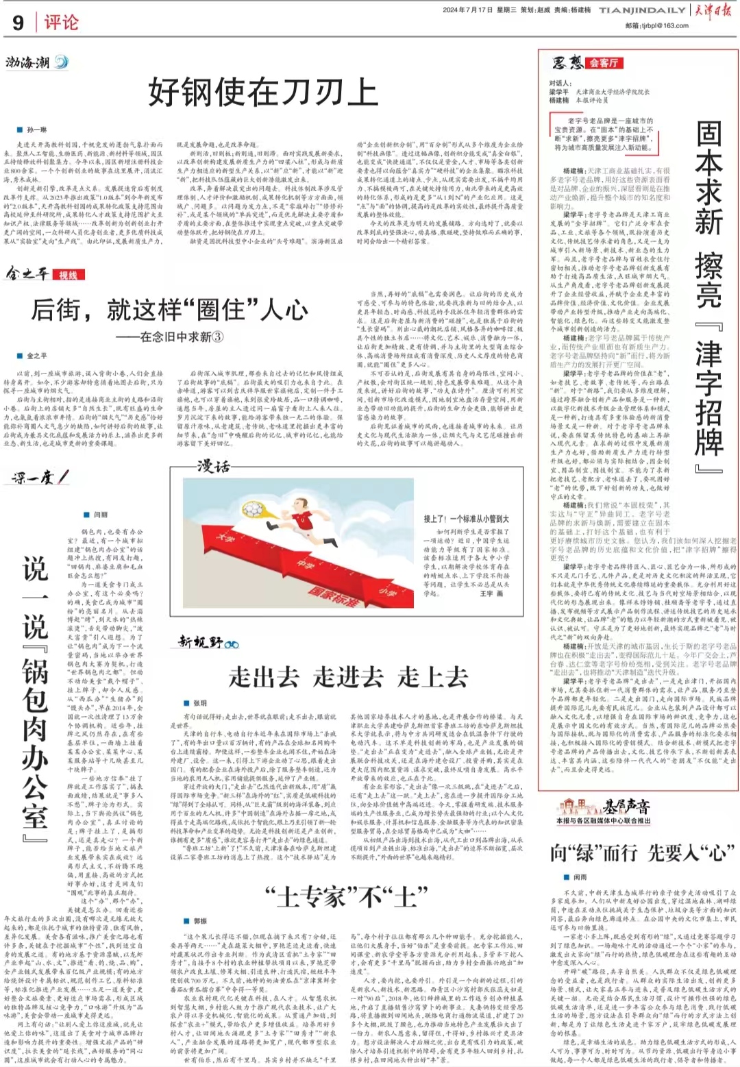 7月17日,kaiyun体育kaiyun体育网页登录入口院长梁学平教授做客《天津日报》9版思想会客厅栏目,就“固本求新 擦亮‘津字招牌’”话题,与日报评论员开展对话。他指出,老字号老品牌是天津工商业发展的“金字招牌”。它们广泛分布在食品、工业、文旅等各个领域,既扮演着历史文化、传统技艺传承者的角色,又是一支为城市引入新场景、新技术、新业态的生力军。而且,老字号老品牌与百姓衣食住行密切相关,推动老字号老品牌创新发展有助于打造高品质生活,点旺城市烟火气。